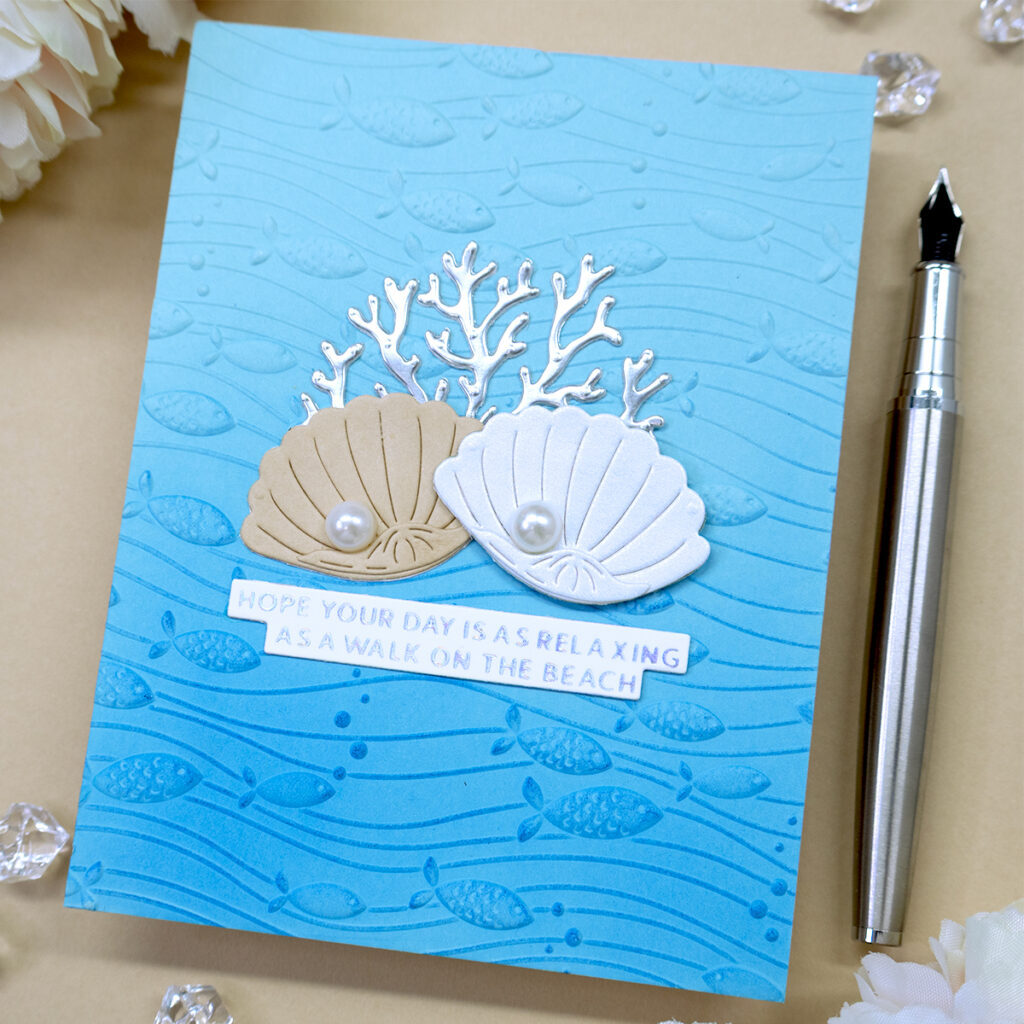 - Dry emboss the hot foiled panel with the Spellbinders “Underwater Waltz” 3D embossing folder.