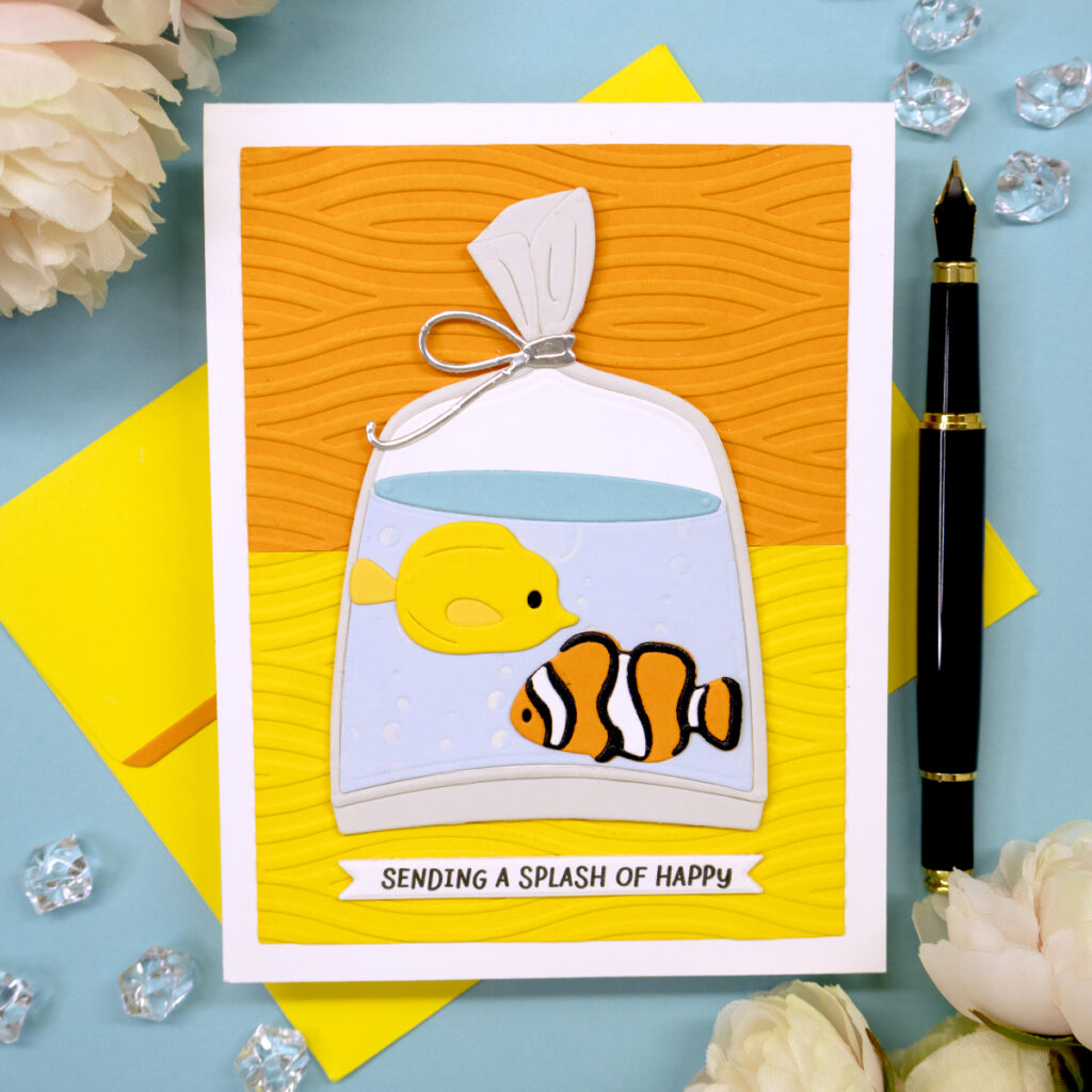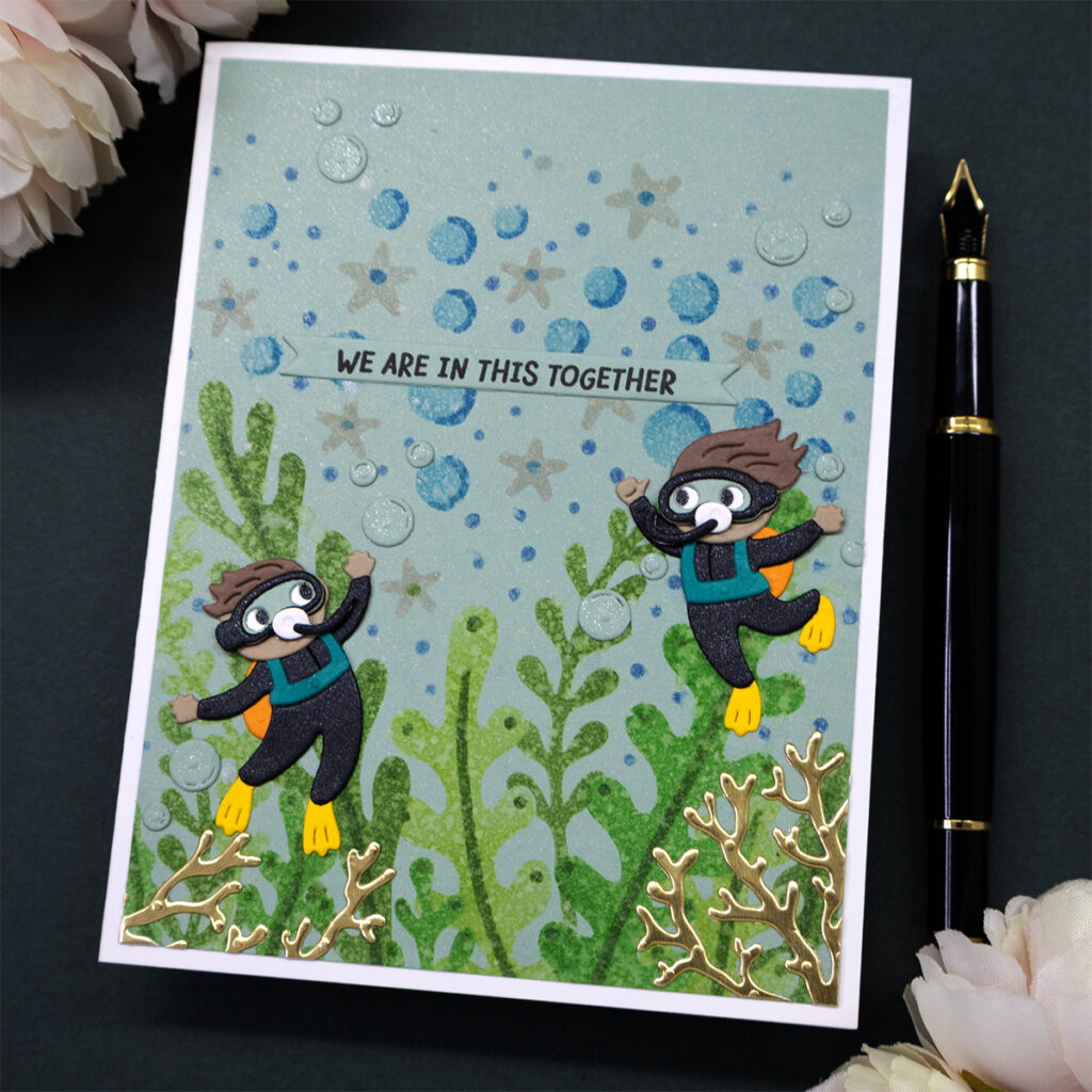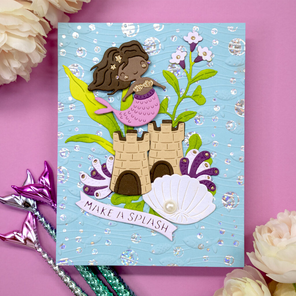 - Hot foil a sentiment with the Spellbinders “Beneath The Bubbles” hot foil set, or stamp and die cut a sentiment banner with the Spellbinders “Paper Splash” clear stamp and die set.