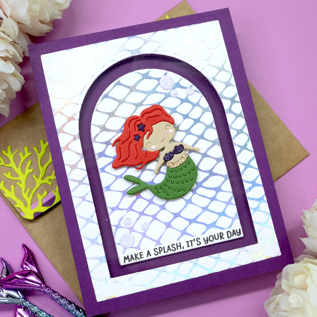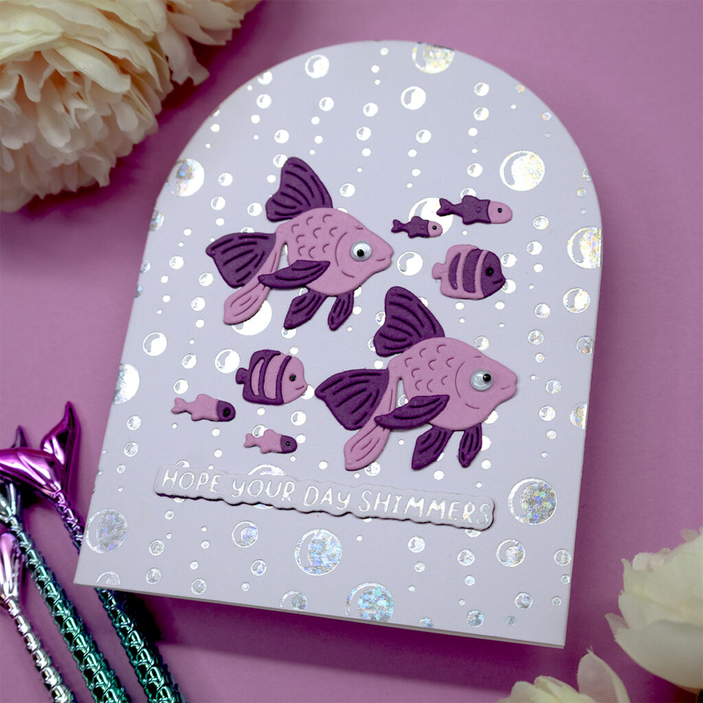 - Hot foil your arched panel and a sentiment with hot foil plates included in the Spellbinders “Beneath The Bubbles” hot foil set and a piece of foil in the color “Speckled Prism”
