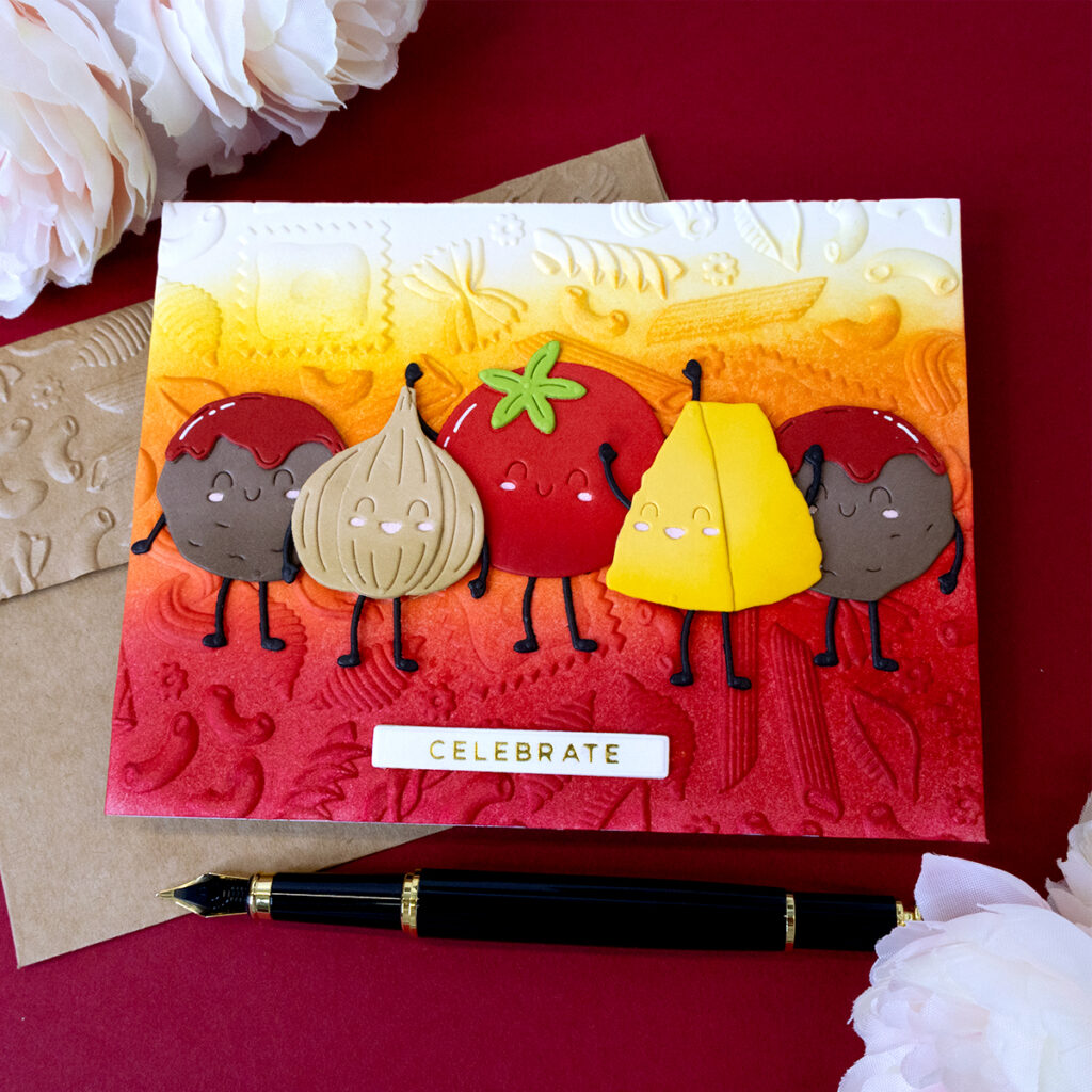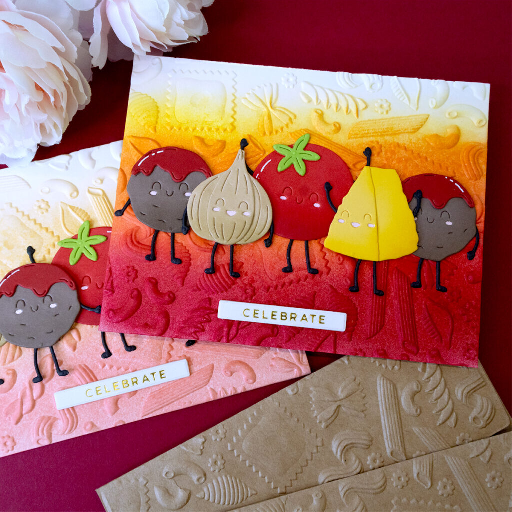 Hello crafters! Today’s note cards are featuring some amazing products released as part of the Spellbinders “Buon Appetito” collection which is simply exceptional! With this collection we will be able to create very fun and unique projects with a pasta theme!