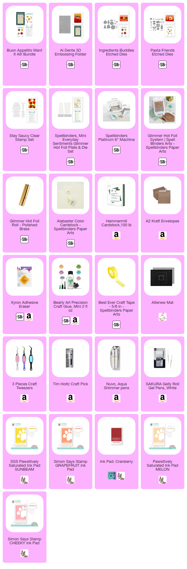 - Spellbinders has a sentiment stamp set released as part of this collection with simply amazing (and really funny) sentiments that go really well with this collection’s theme (unfortunately I do not have it yet, but I plan on purchasing it soon, and I highly recommend it (I have it listed in the supply list below). One of my favorite sentiments from this set is the “More Spaghetii, less upsetti”, LOL!
